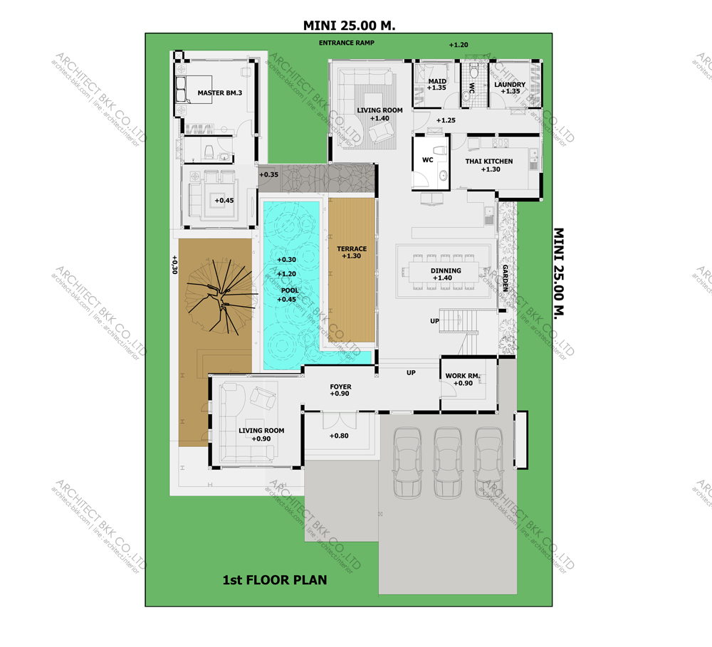 จากแปลนบริเวณหน้าบ้านจะเป็นพื้นที่จอดรถสำหรับ 3 คัน เมื่อเข้าบ้าน เดินขึ้นบันได 3 ขั้นเพื่อเข้าไปในบ้าน ด้านซ้ายมีห้อง living room พื้นที่นั่งเล่น ทางเชื่อมต่อเดินด้านขวามือ ห้องทำงาน ติดกับบันได สามารถเดินขึ้นชั้นสองห้องนอนส่วนตัวได้เลย หรือ จะไปพื้นที่รับประทานอาหาร เปิดประตูบานเลื่อน ไปบริเวณโซนกลางของบ้านระเบียงสระและสระน้ำ ถ้าจะเปิดม่านตอนนั่งรับประทานอาหารกับครอบครัว ก็ได้บรรยากาศรีสอร์ทได้อย่างดีเลยทีเดียว บริเวณนี้เป็นพื้นที่โล่งมองได้ไกล มีต้นไม้ ลองนึกภาพตามดูนะครับ