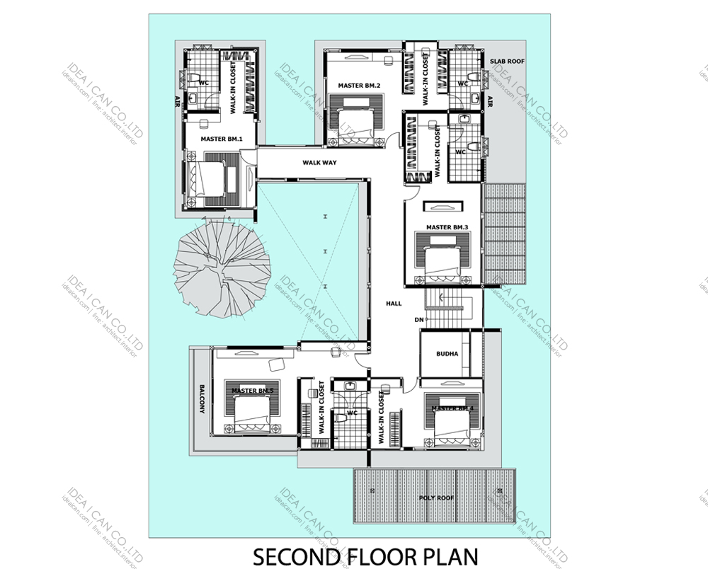 ห้องนอน Master Bedroom 5 สำหรับห้องนอน Master Bedroom 5 มีระเบียง สามารถเปิดหน้าต่างออกมาพักผ่อน พักสายตา ชมวิวหน้าบ้าน และด้านข้างบ้านได้ตลอดแนว มาดูพื้นที่ใช้สอยชั้นสองโซนด้านขวามือกันบ้างครับ เมื่อขึ้นบันไดมา เป็นห้องนอน Master Bedroom 3 และ Master Bedroom 2 ตามลำดับ สำหรับห้องนอน Master Bedroom 1 มีทางเดินแยกออกไป เหมือนห้องนอนของชั้นล่าง