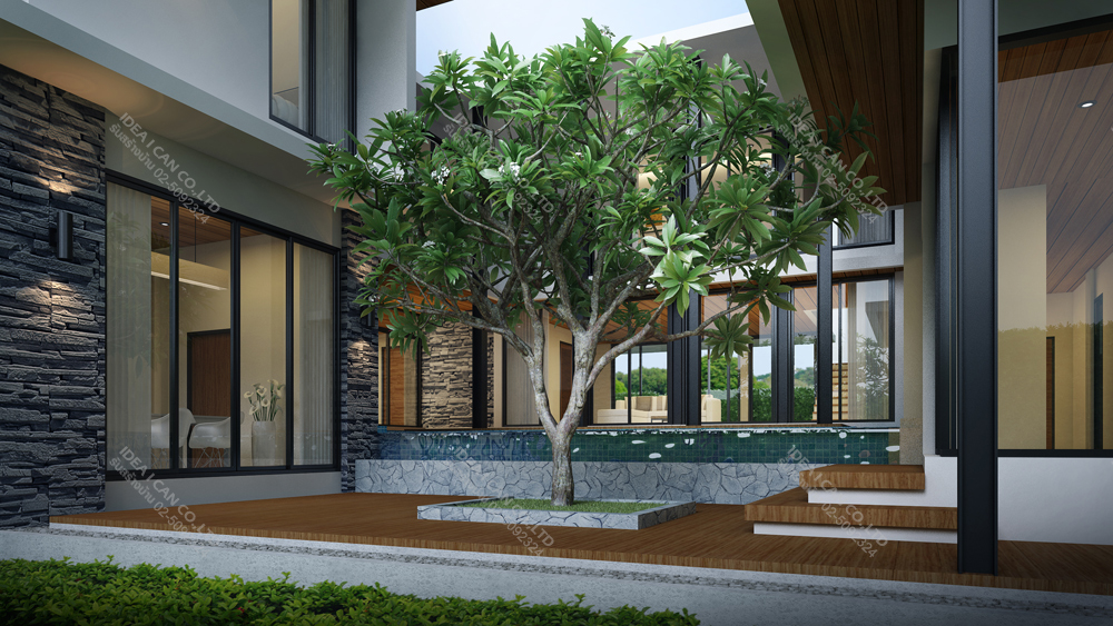 บริเวณพื้นที่ใช้สอยโซนกลางของบ้านพื้นที่เล่นระดับ พื้นที่พักผ่อนในสไตล์รีสอร์ท สระว่ายน้ำ ระเบียงรอบสระ มีต้นไม้ เป็นแบบบ้านอีกแบบที่มีพื้นที่โซนกลาง สามารถทำกิจกรรมพักผ่อนสไตล์รีสอร์ท อย่างเป็นส่วนตัว
