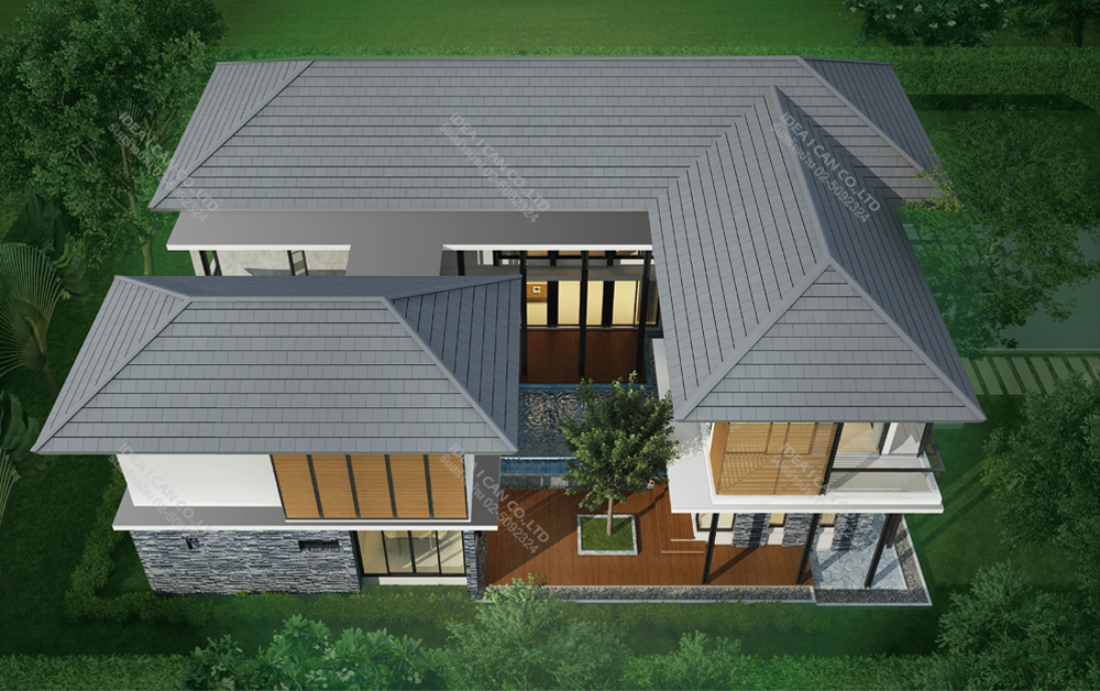 มุมภาพด้านบน ด้านหลังของบ้านจะมองเห็นสระน้ำ โซนกลางของบ้าน มีทางเดินจากหน้าบ้านไปบริเวณสระน้ำได้